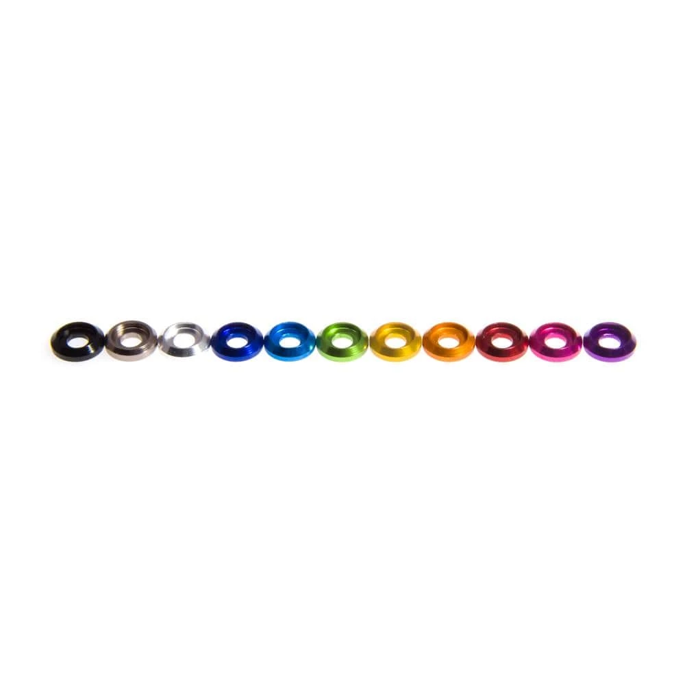 Individual anodized aluminum M3 stepped washers for button / pan head screws in a variety of colors sure to suit your next build.