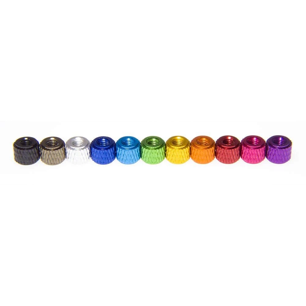 Individual anodized aluminum M3 knurled female standoff with small step in a variety of colors sure to suit your next build.