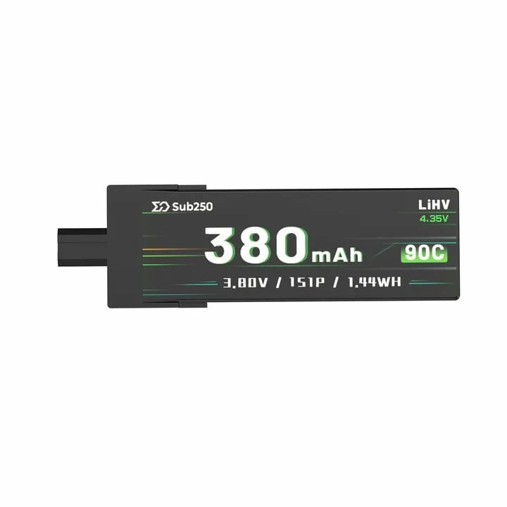 Sub250 1S 380mAh 3.8V LiHV High-voltage lithium battery is specially designed for Indoor Micro FPV drones. It is small volume, lightweight, and High capacity. It can discharge up to 90C, providing sufficient power for flight. Sub250 LiHV 1S battery’s USB charging board is used for charging, It’s extremely convenient and High-efficiency!