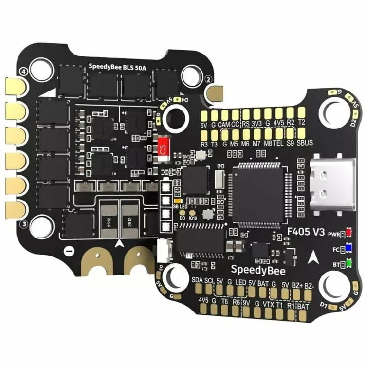 The Speedy Bee F405 50A Stack V3 includes all the features a user would expect from a modern flight controller and ESC stack, but at an incredible price.ย The F405 V3 flight controller features the STM32F405 MCU, an onboard 4-level battery life indicator, a Micro-SD card slot for Blackbox logging, 4 groups of LED strip pads, a DJI plug for digital quads, and built-in Bluetooth for wireless configuration through the SpeedyBee App.ย The 50A 4-In-1 ESC features a built-in TVS protective diode, and Japanese made TDK SMT capacitors, and even comes with a low ESR 1500uF capacitor.