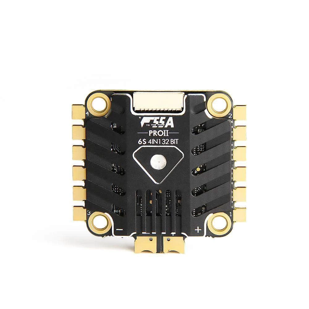 The F55A Pro II is a premium-built 4in1 ESC from T-Motor. Fully capable of pushing 6s with 75A burst and a sustained 55A current draw. Equipped with the latest in ESC technology such as 32-bit capability and BLHeli32 firmware.