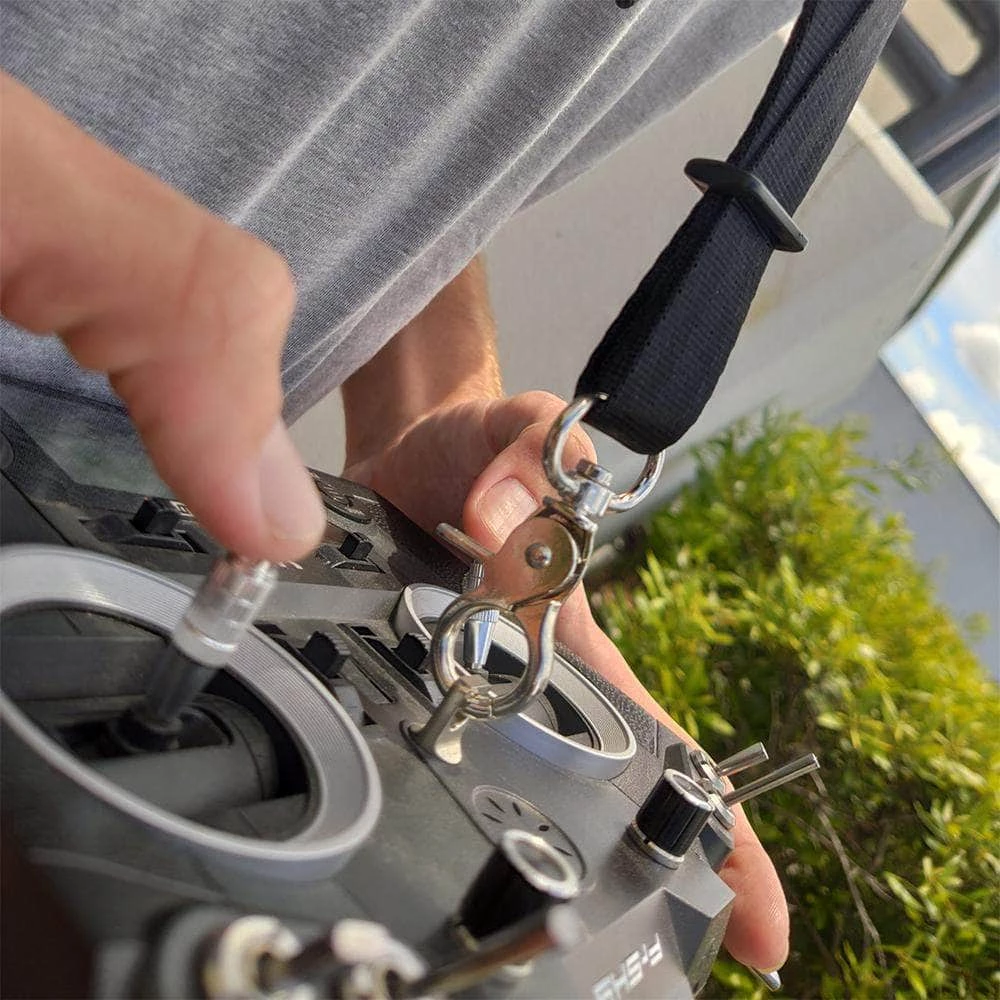 Our padded heavy duty TX lanyard provides ultimate comfort and control. A great option for all day sessions and long duration flying! Featuring our new logo on the strap and pad, and a super secure hook mechanism. The durable strap material is 2cm wide, expanding to 3.2cm around the neck and shoulders, with a 5.5cm wide neck pad.