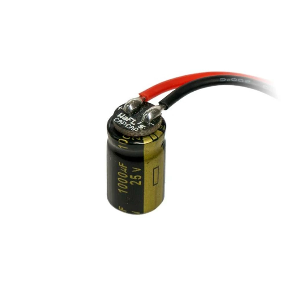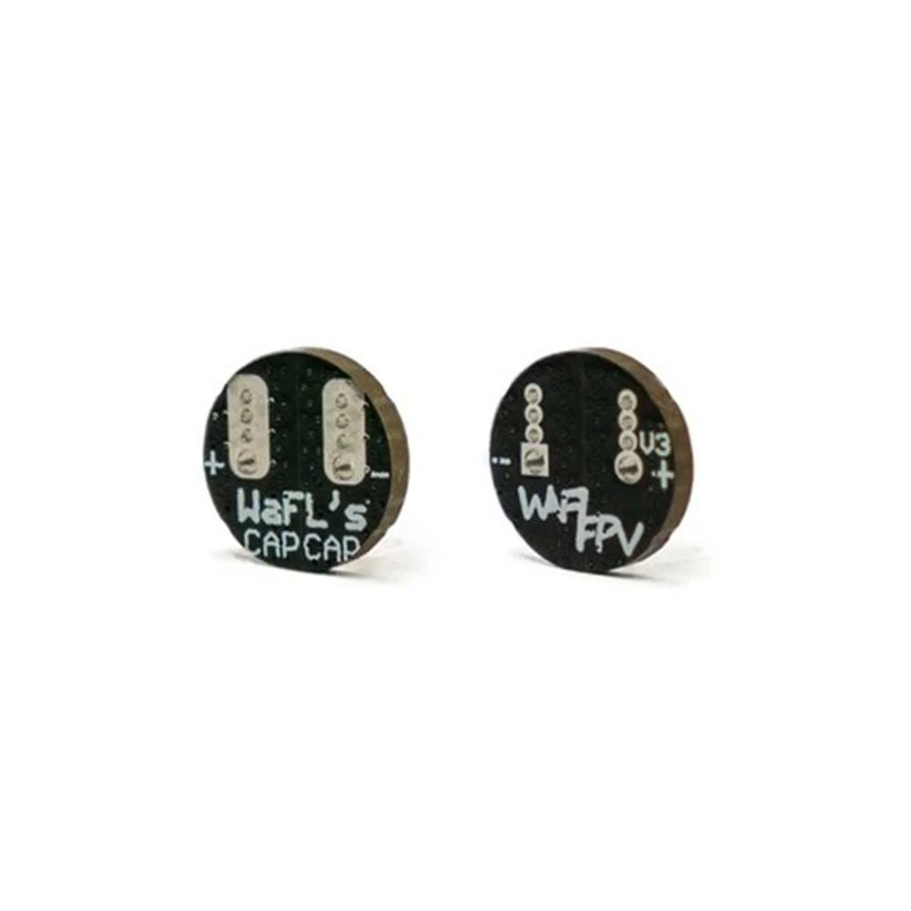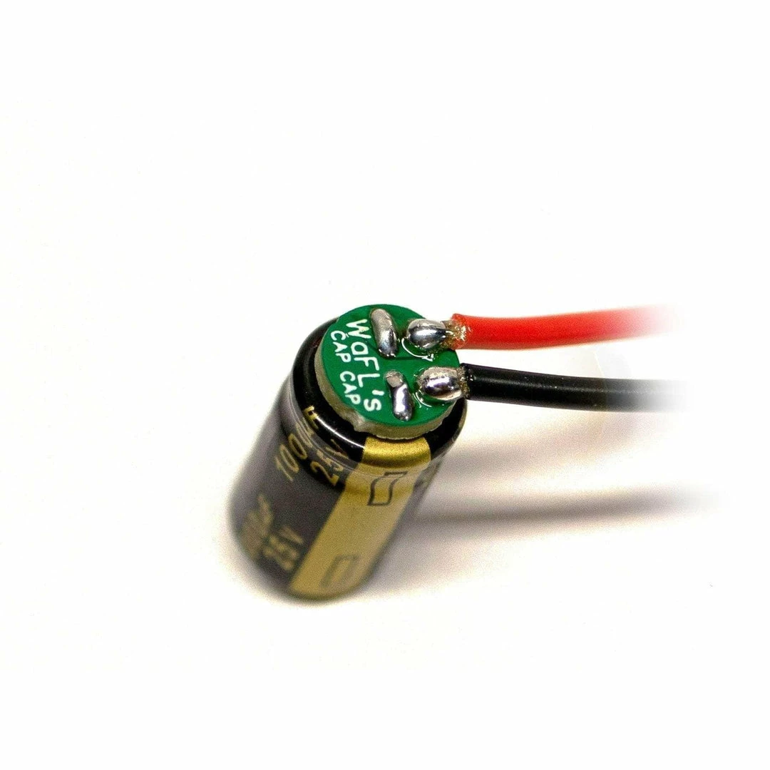 Are you tired of trying to solder wires on those pesky little capacitor leads? Step your builds up a notch with WaFL’s Cap Cap. This tiny PCB sits on the bottom of most standard “LOW ESR” capacitors, and provides you with two easily accessible pads for quick and clean soldering to the capacitor. Whether you need to quickly swap a broken capacitor after a hard crash, or simply don’t have enough room near your battery pads for your cap to cleanly rest, the Cap Cap makes attaching a wire to your capacitor simple, letting you mount it anywhere on your frame. Comes in a set of 5!